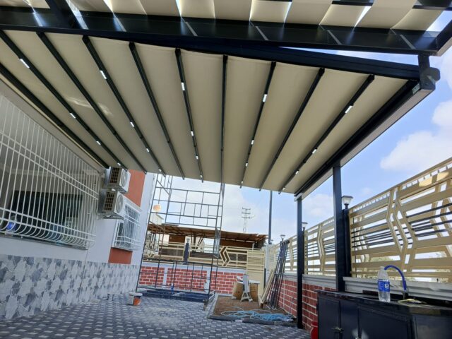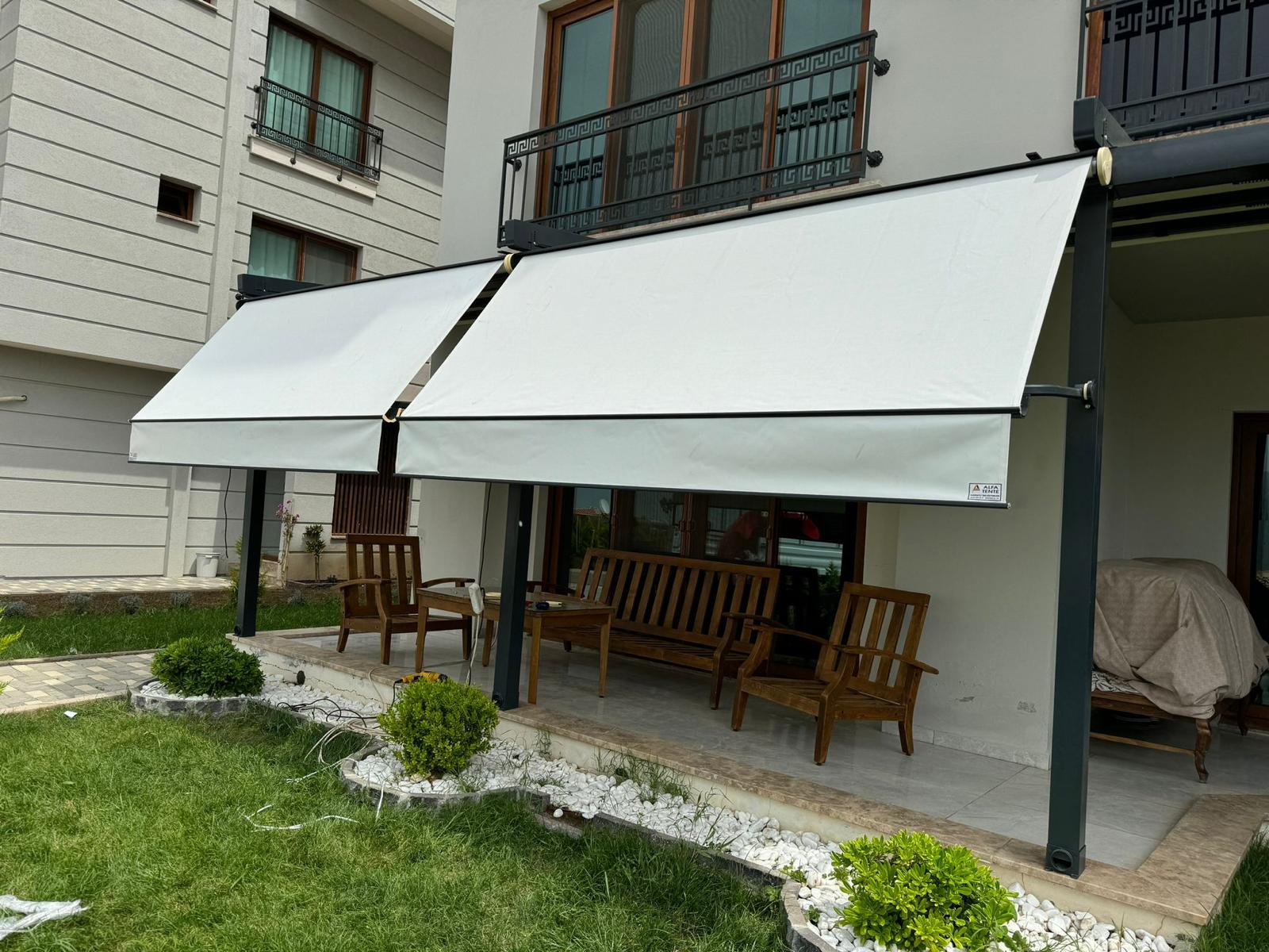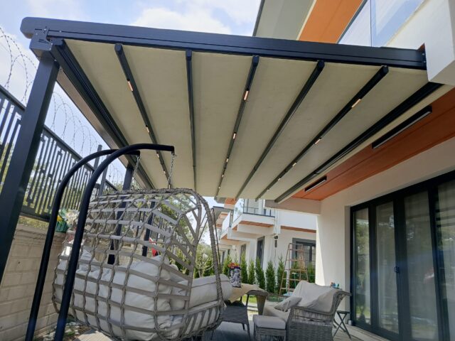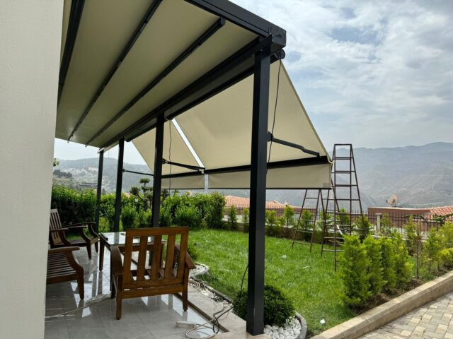 Pergola Tente: Dört mevsim kullanıma uygun, sabit ve güçlü taşıyıcı ayaklara sahip, genellikle motorlu sistemlerdir.